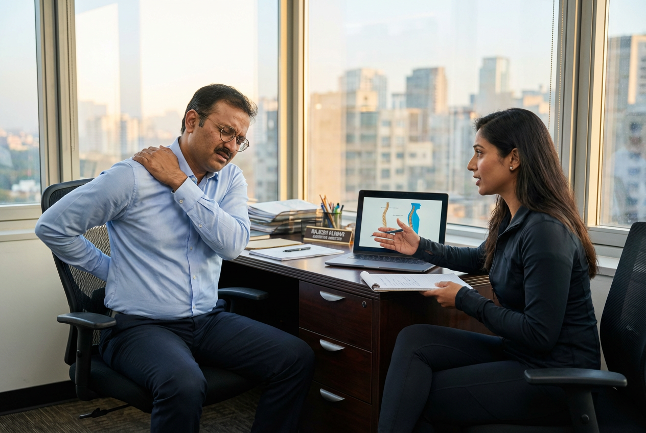 When you sit for 8-10 hours a day, certain muscles (like your glutes, deep core, and mid-back) essentially go offline. Other muscles (hip flexors, upper traps, lower back) take over and become chronically overworked. This creates a cascade of problems: